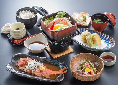 伊豆のお魚・金目鯛の姿煮・せいろ蒸し・お刺身・天ぷら豪華御膳をお召し上がりください♬